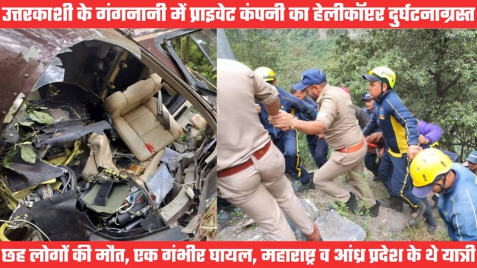 उत्तरकाशी/देहरादून। उत्तरकाशी जिले में गंगनानी के समीप बृहस्पतिवार सुबह एक प्राइवेट कंपनी का हेलीकॉप्टर दुर्घटनाग्रस्त हो गया। दुर्घटना में छह लोगों की मौके पर ही मौत हो गई, जबकि गंभीर रूप से घायल एक यात्री को एयरलिफ्ट कर एम्स ऋषिकेश पहुंचाया गया। मुख्यमंत्री पुष्कर सिंह धामी समेत कई अन्य लोगों, संस्थाओं व संगठनों ने दुर्घटना पर दुख व्यक्त किया है।